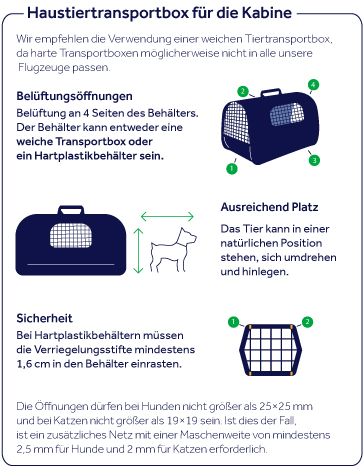 Für die sichere und komfortable Reise Ihres Haustieres in der Kabine empfehlen wir die Verwendung einer weichen Tiertransportbox. Der Platz unter dem Sitz vor Ihnen kann je nach Flugzeugtyp variieren, und harte Transportboxen passen möglicherweise nicht in alle unsere Flugzeuge.