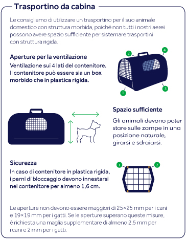 Per garantire un sicuro e confortevole viaggio del suo animale domestico in cabina, le consigliamo di utilizzare un trasportino con struttura morbida. Lo spazio sotto il sedile davanti a lei può variare a seconda del tipo di aereo e non tutti i nostri aerei possono avere spazio sufficiente per sistemare trasportini con struttura rigida.